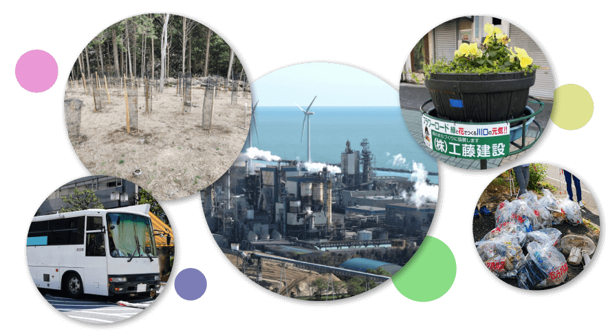 - 環境保全事業推進にあたり環境への影響を極力抑えるとともに、地域清掃や植樹活動を行います。